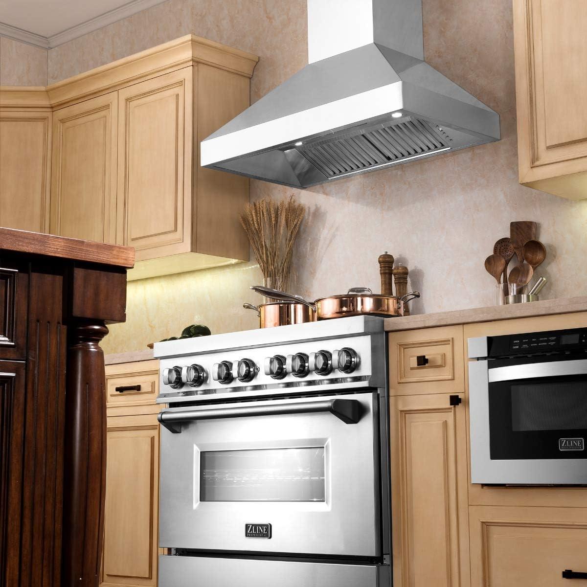 ZLINE 36 in. Wall Mounted Range Hood in Stainless Steel is one of the best-selling of the 30 in. models. Modern design, clean stainless steel finish and factory tested assurance of performance make this hood the perfect addition to your kitchen and reliable for years to come. Complete with 4-speed fan control, dishwasher-safe baffle filters for easy cleanup and an autotimer with delayed shutoff make put this range hood model ahead of its time. Powerful, yet surprisingly quiet 900 CFM venting moves large amounts of air away from your cook-stove area. The installation of this product is one of the easiest in the industry. Includes a free upgrade to LED lights for brighter and more energy efficient lighting. This range hood will surpass your expectations.