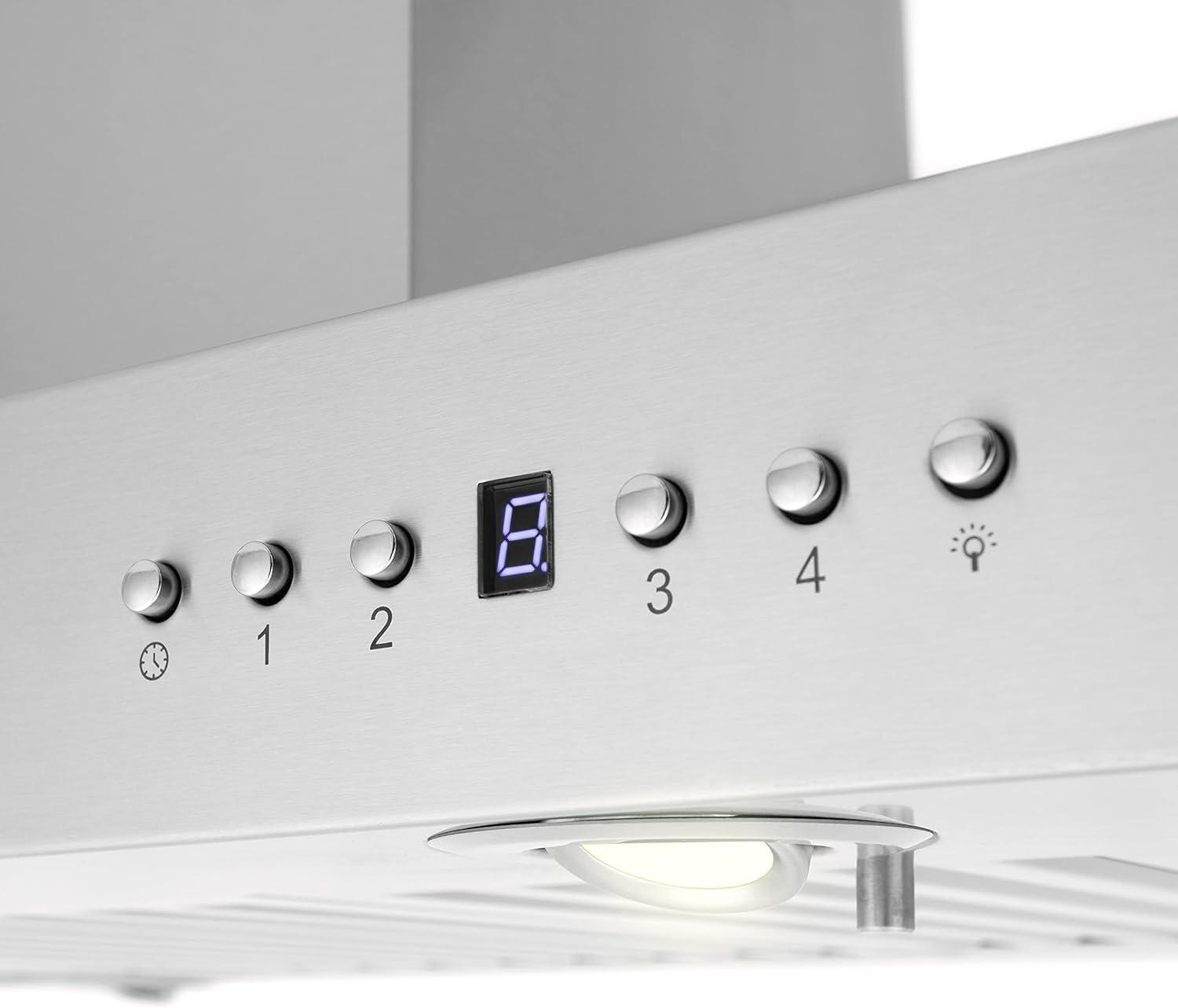 Our most popular style of range hoods. Stunningly sleek brushed stainless steel. Built for years of trouble free use. Other specifications are: KE230B Power: 110 v/60 Hz Material: 430 Brushed Stainless Output: 760 cfm Lighting: 4 – 20w Halogen Lights Controls: 4 Speed Touch Sensitive Electronic Filters: Stainless Steel Baffle Filters Air Outlet: 6? Certification: CE, GS, ETL and CCC safety approvals (US and Canada) Chimney Extends from 32″ to 42? Easily Convertible to ?Ductless? operation Efficient and Quiet Operation <65db (4.5 Sone).