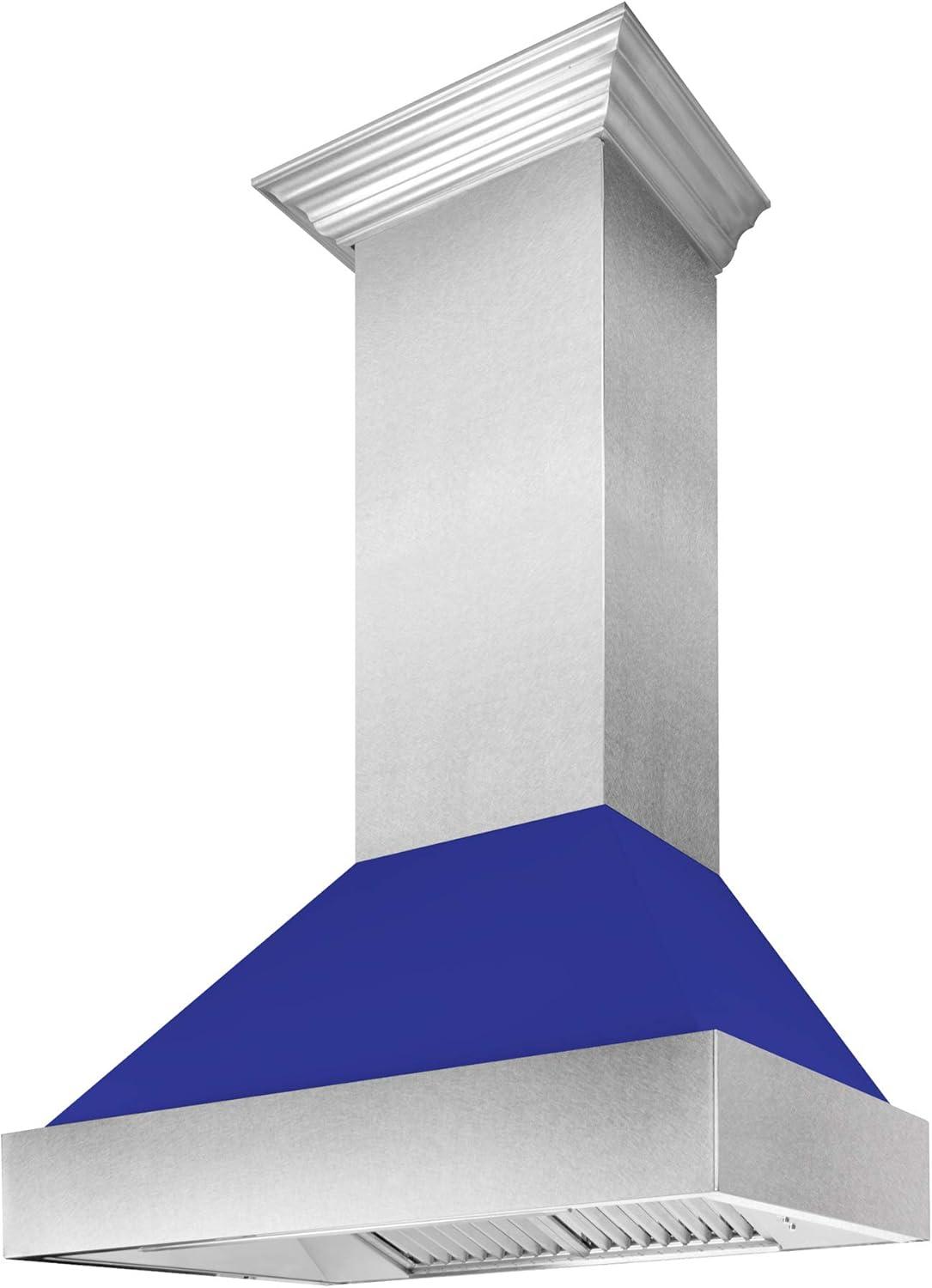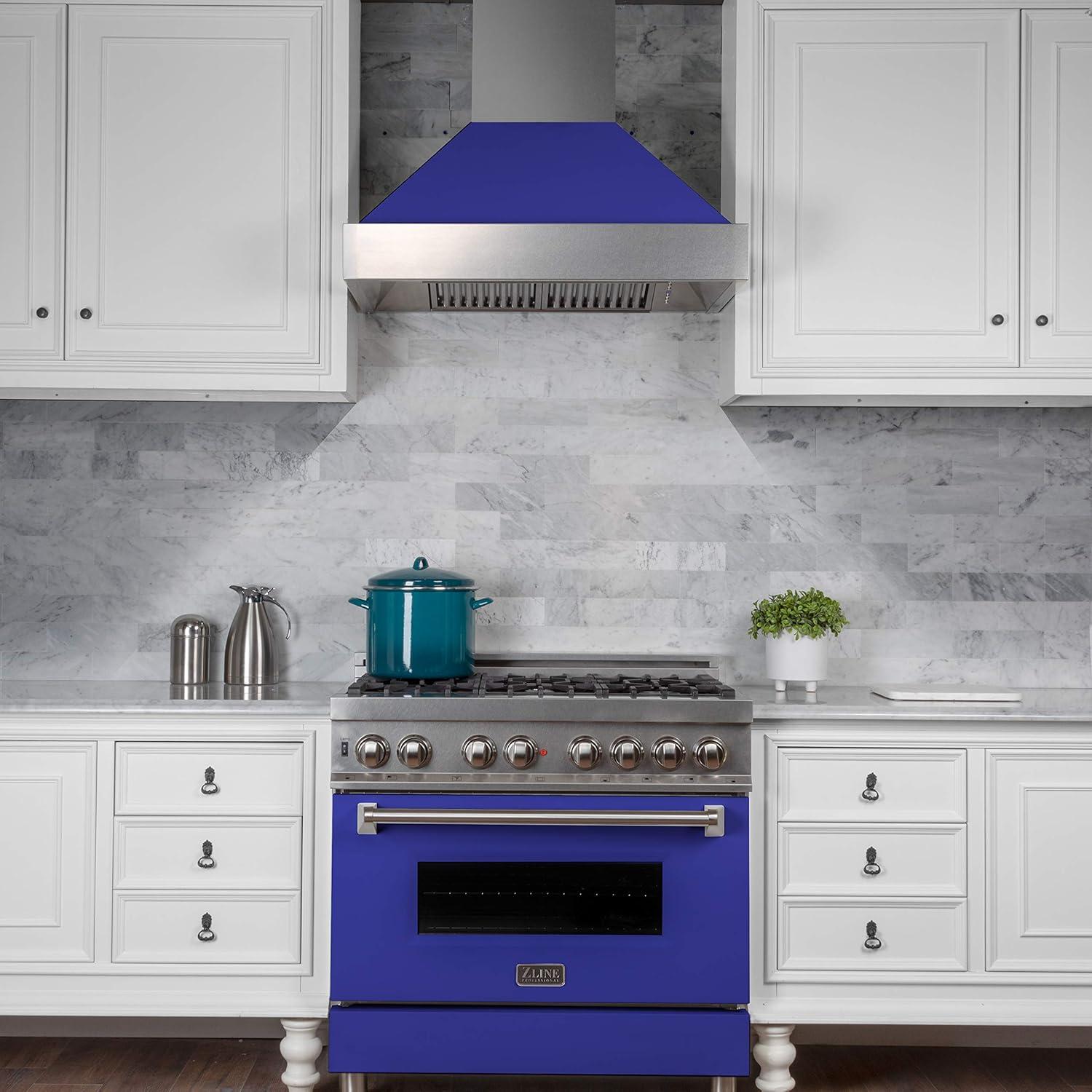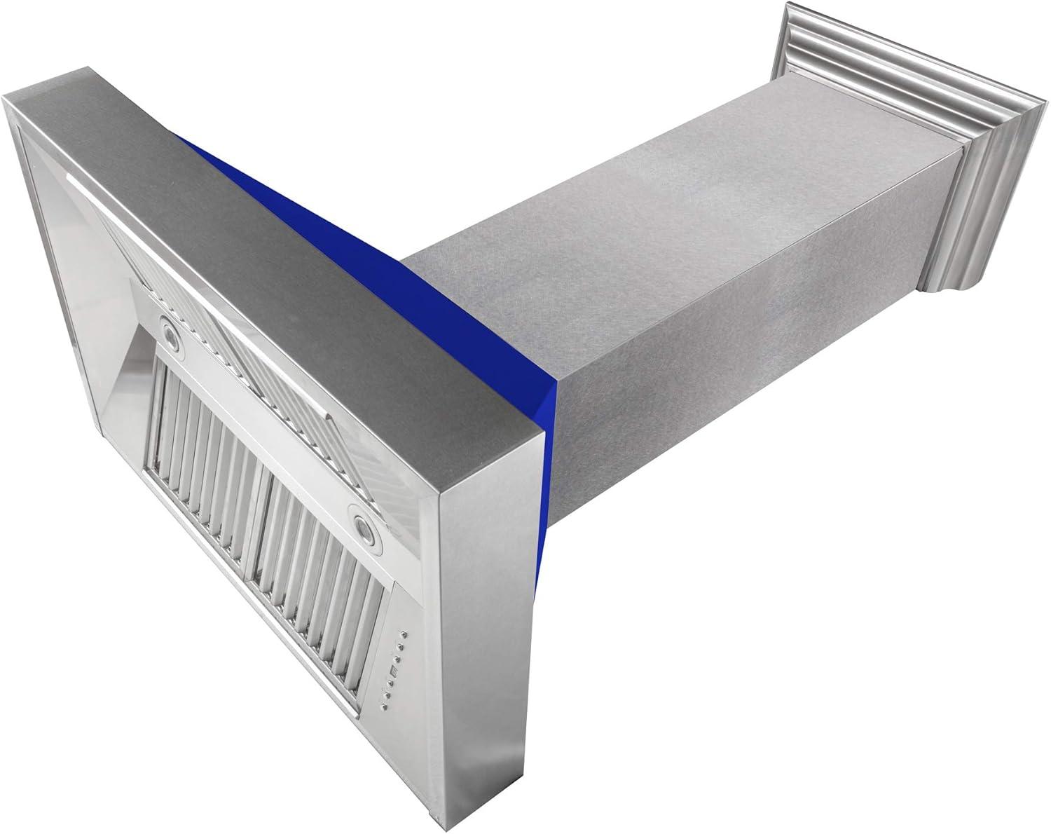 Blue Matte Shell – This ZLINE range hood is equipped with an elegant blue matte shell paired with a Satin Stainless Steel front face and chimney to give your kitchen an elevated, bold look