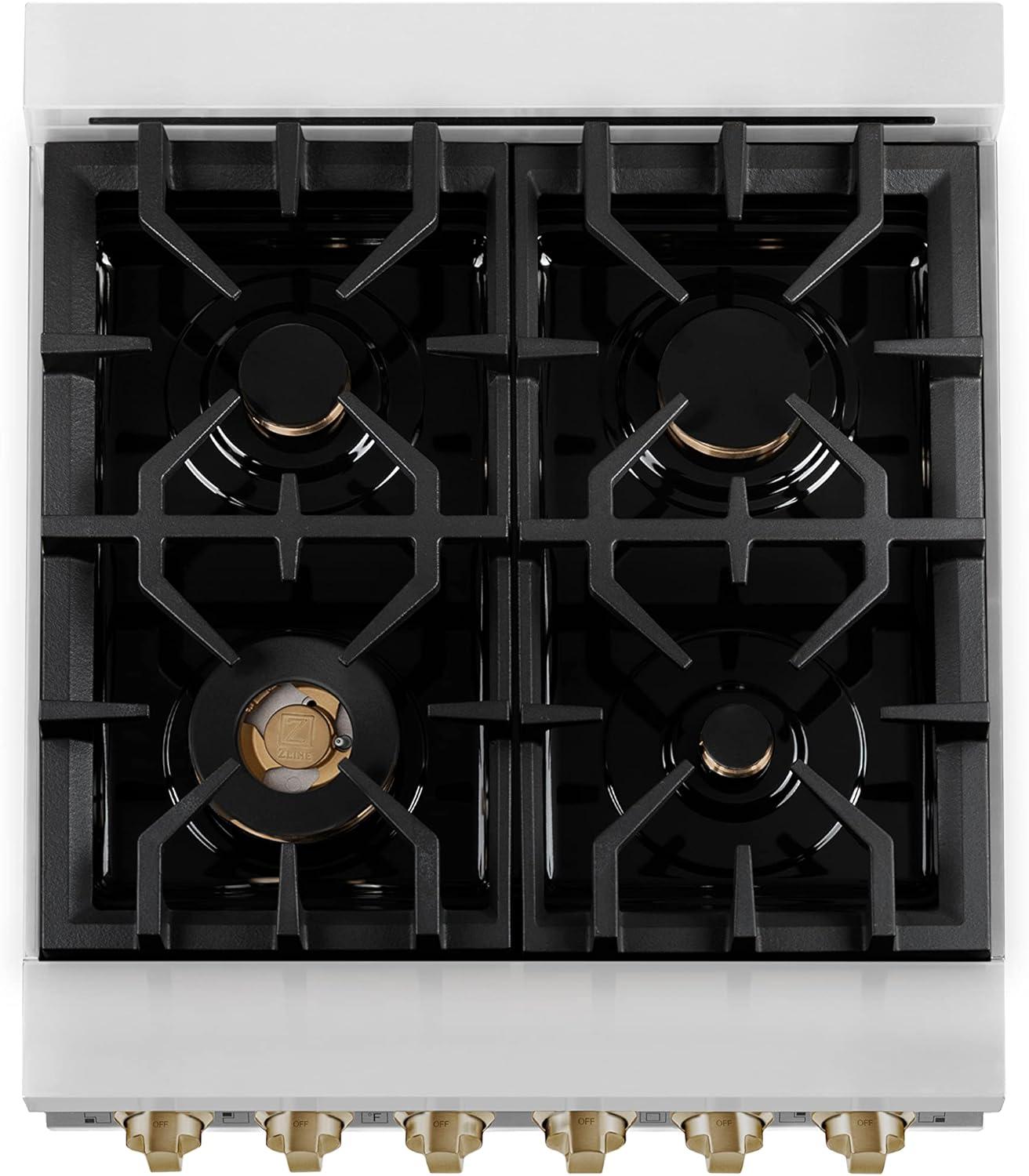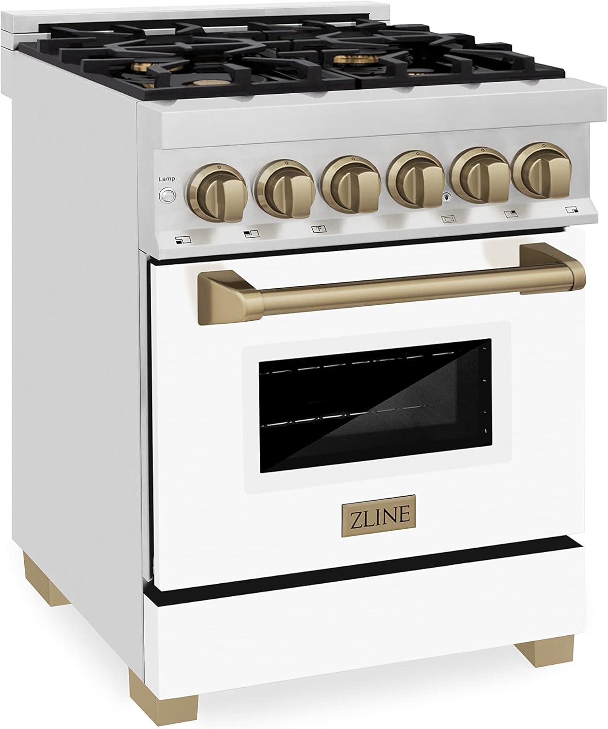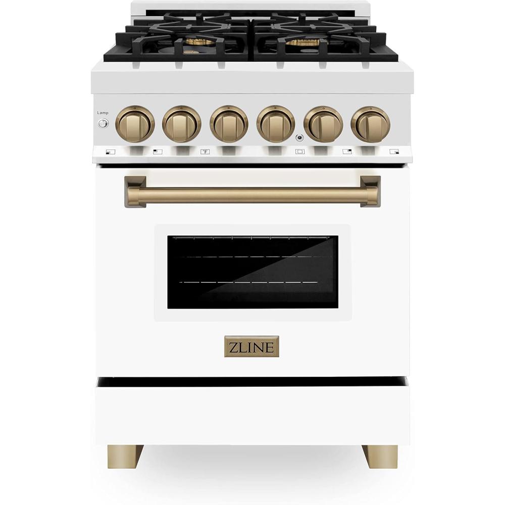 Luxury isn’t meant to be desired – it’s meant to be attainable. The ZLINE Autograph Edition 24 in. 2.8 cu. ft. Legacy Dual Fuel Range with 4 Burner Gas Cooktop and Electric Convection Oven in Stainless Steel with White Matte Door and Champagne Bronze Accents (RAZ-WM-24-CB) pairs a powerful gas cooktop with 4 Italian-crafted burners, an electric convection oven, a beautiful white matte door with a Landscape window design, and elegant champagne bronze knobs and handle. With innovative features designed to enhance your kitchen’s capability, ZLINE Legacy Dual Fuel Ranges provide a professional culinary experience by pairing unmatched performance with timeless style.
