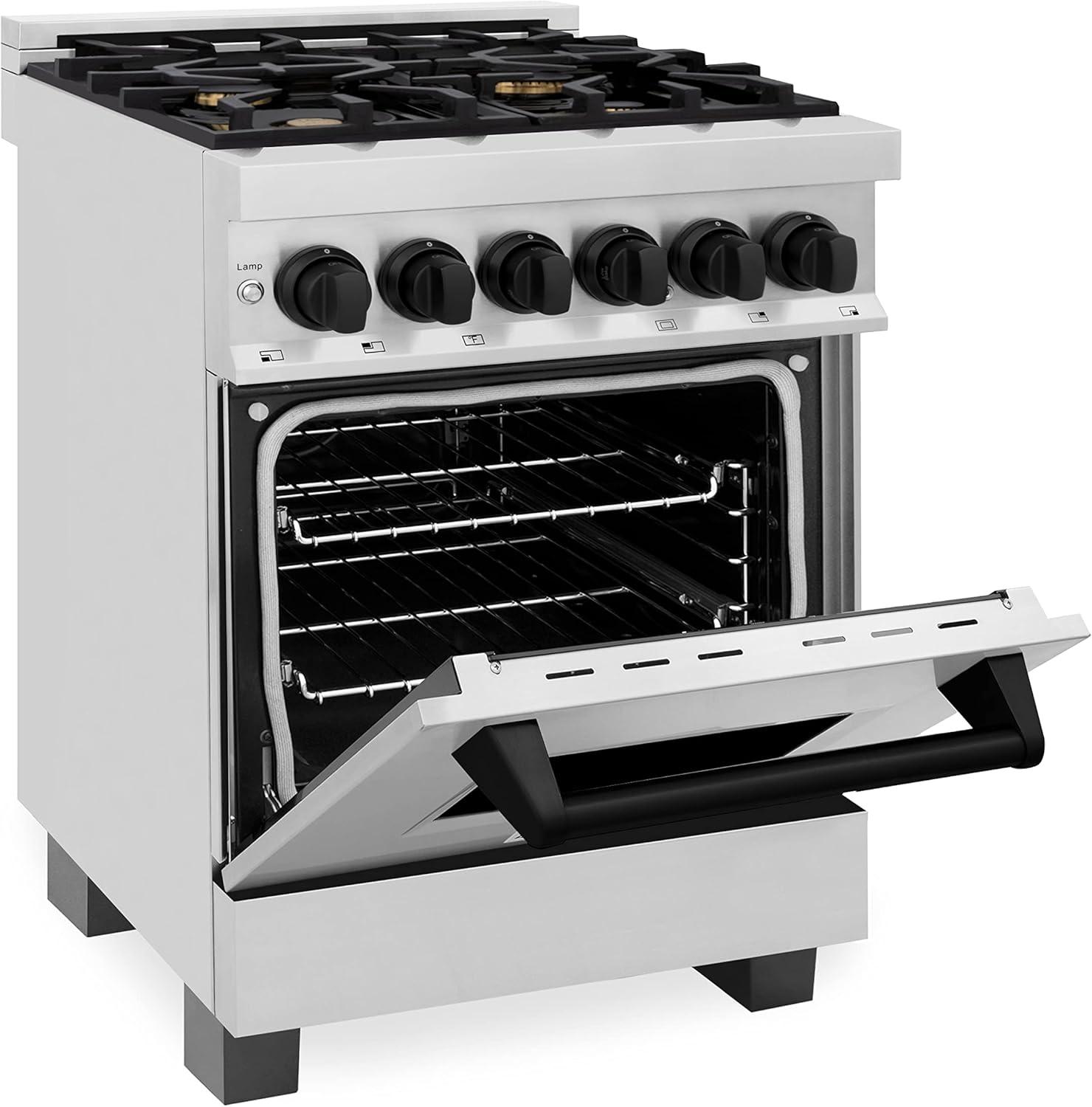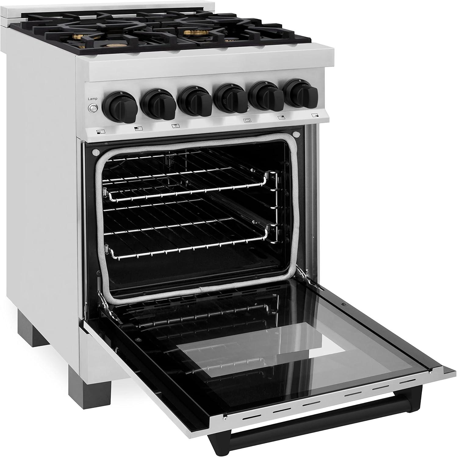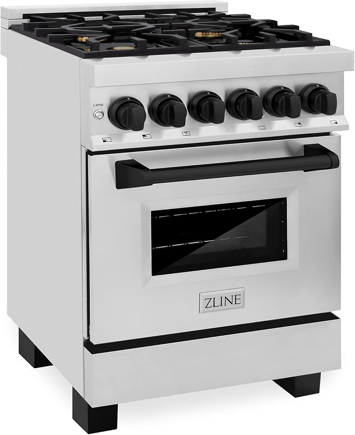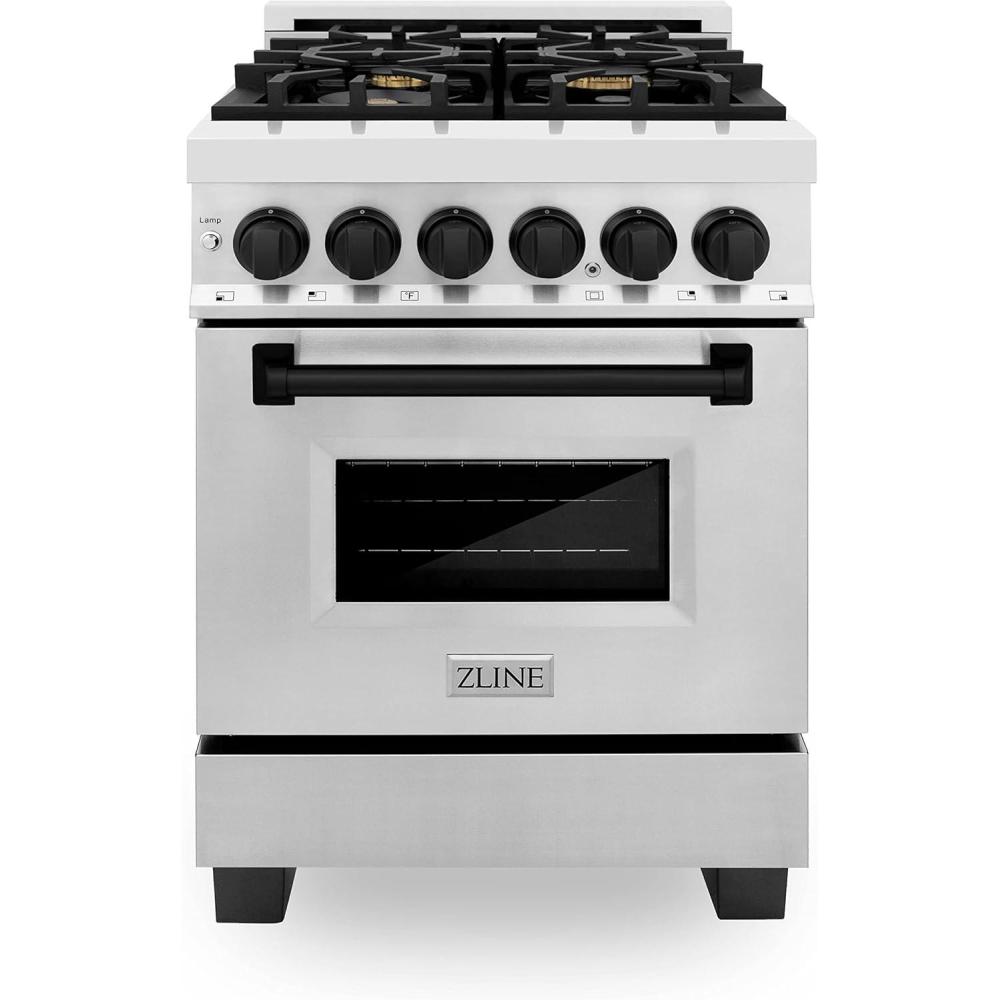 Luxury isn’t meant to be desired – it’s meant to be attainable. The ZLINE Autograph Edition 24 in. 2.8 cu. ft. Legacy Dual Fuel Range with 4 Burner Gas Cooktop and Electric Convection Oven in Stainless Steel and Matte Black Accents (RAZ-24-MB) pairs a powerful gas cooktop with 4 Italian-crafted burners, an electric convection oven with a Landscape oven door window design, and elegant matte black knobs and handle. With innovative features designed to enhance your kitchen’s capability, ZLINE Legacy Dual Fuel Ranges provide a professional culinary experience by pairing unmatched performance with timeless style.