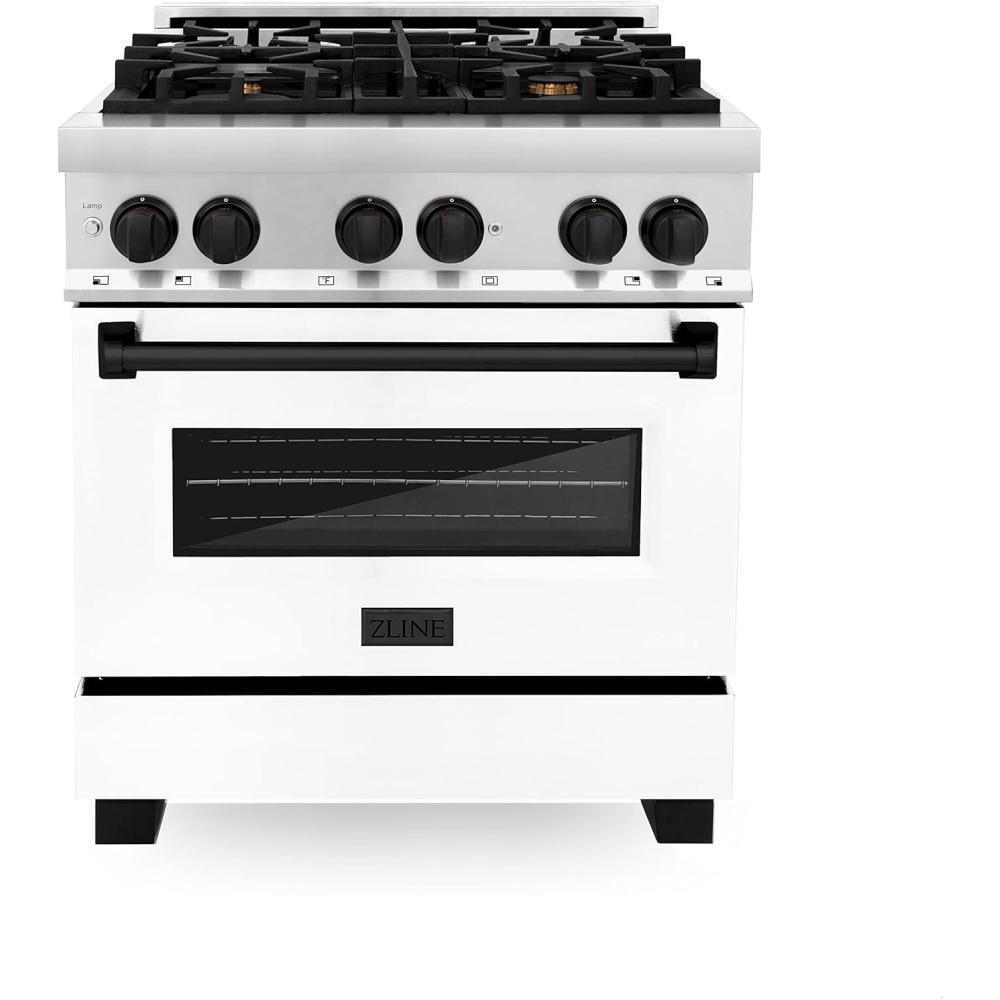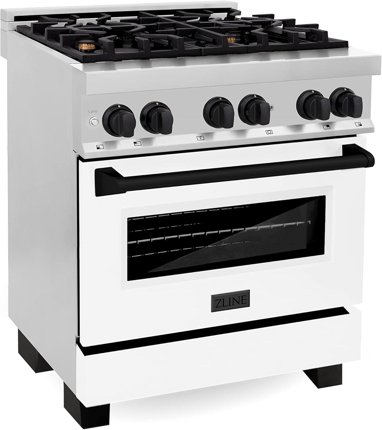 ZLINE Autograph Edition 30 in. 4.0 cu. ft. Legacy Dual Fuel Range with 4 Burner Gas Cooktop and Electric Convection Oven in Stainless Steel with White Matte Door and Matte Black Accents (RAZ-WM-30-MB)
