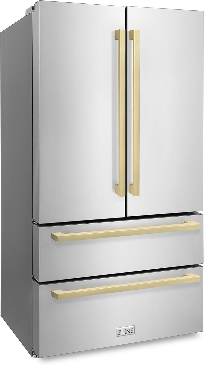 ZLINE Autograph Edition 36 in. 22.5 cu. ft. Counter-Depth French Door Refrigerator with Ice Maker in Fingerprint-Resistant Stainless Steel with Champagne Bronze Modern Handles (RFMZ-36-FCB)