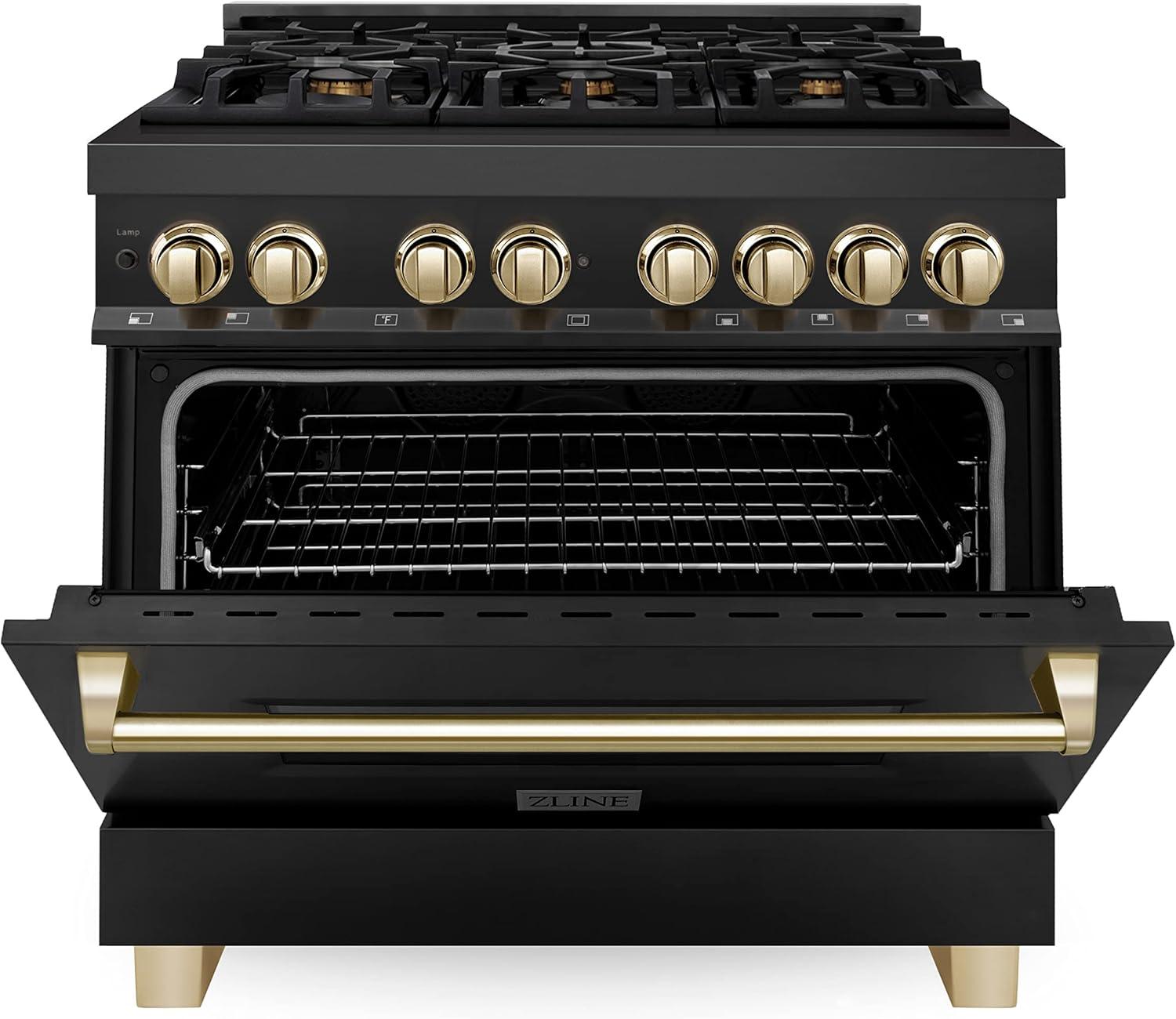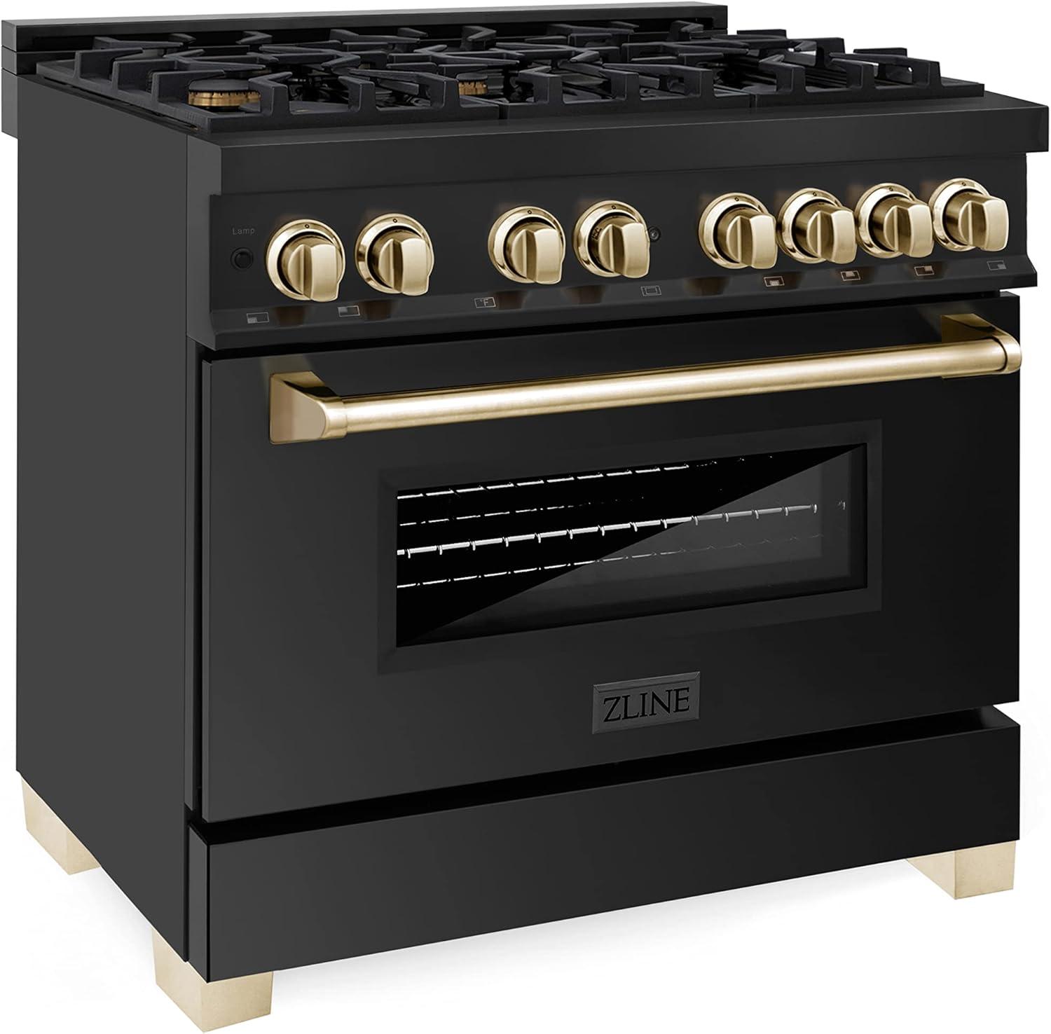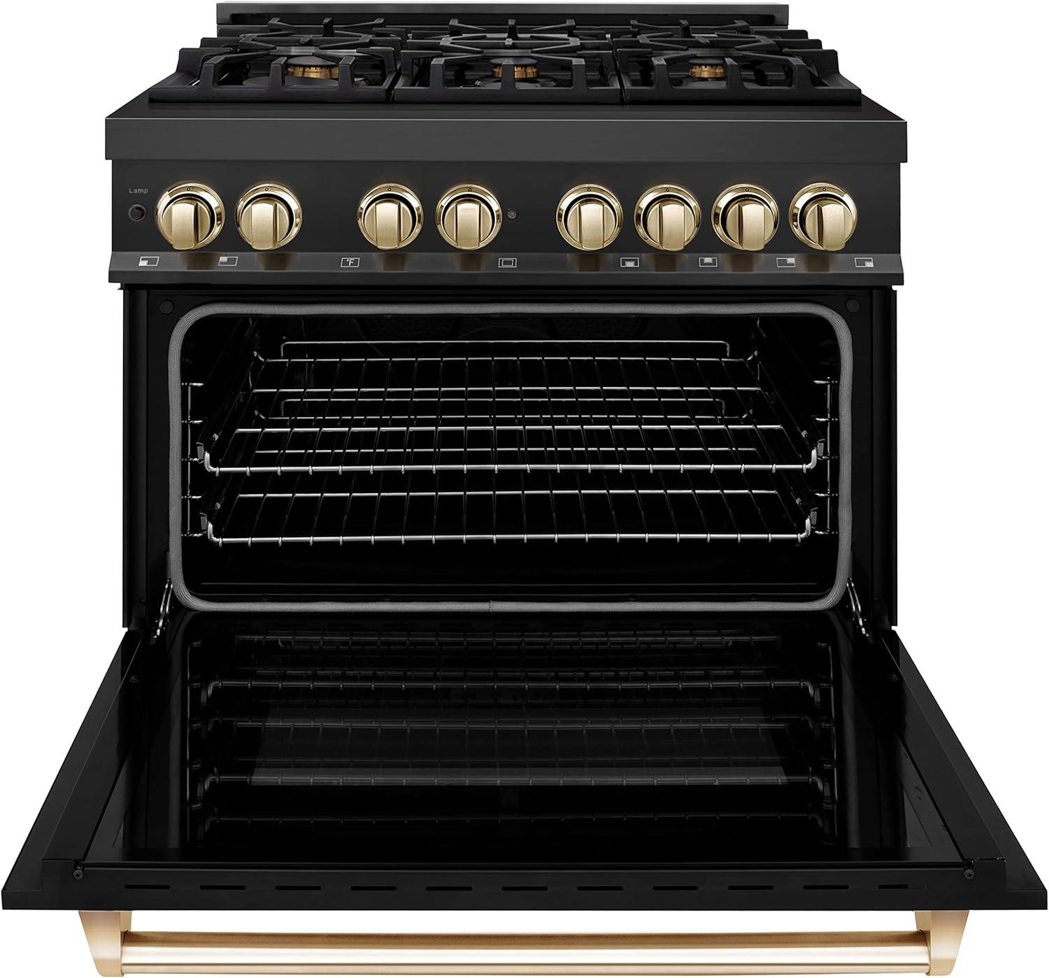Luxury isn’t meant to be desired – it’s meant to be attainable. The ZLINE Autograph Edition 36 in. 4.6 cu. ft. Legacy Dual Fuel Range with 6 Burner Gas Cooktop and Electric Convection Oven in Black Stainless Steel and Polished Gold Accents (RABZ-36-G) pairs a powerful gas cooktop with 6 Italian-crafted burners, an electric convection oven with a Landscape oven door window design, and elegant polished gold knobs and handle. With innovative features designed to enhance your kitchen’s capability, ZLINE Legacy Dual Fuel Ranges provide a professional culinary experience by pairing unmatched performance with timeless style.
