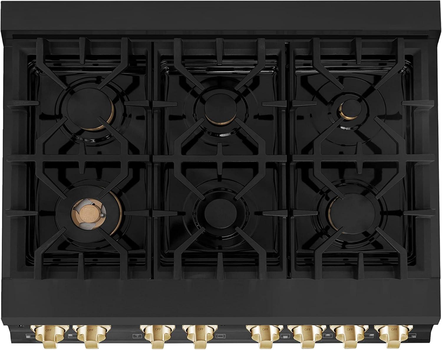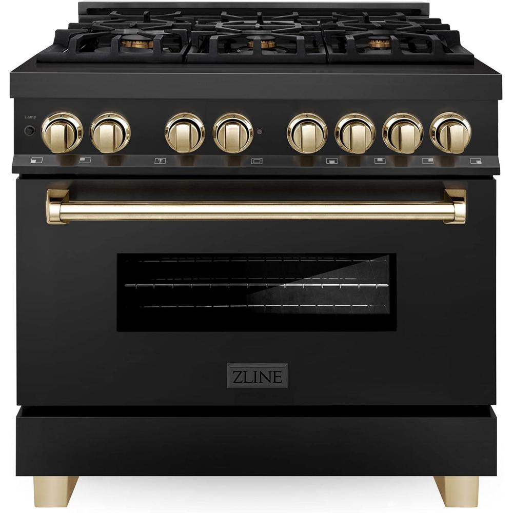 ZLINE Autograph Edition 36 in. 4.6 cu. ft. Legacy Dual Fuel Range with 6 Burner Gas Cooktop and Electric Convection Oven in Black Stainless Steel and Polished Gold Accents (RABZ-36-G)