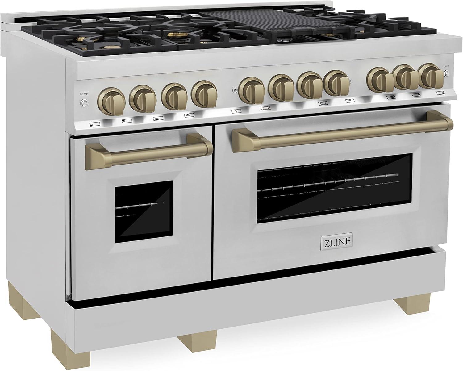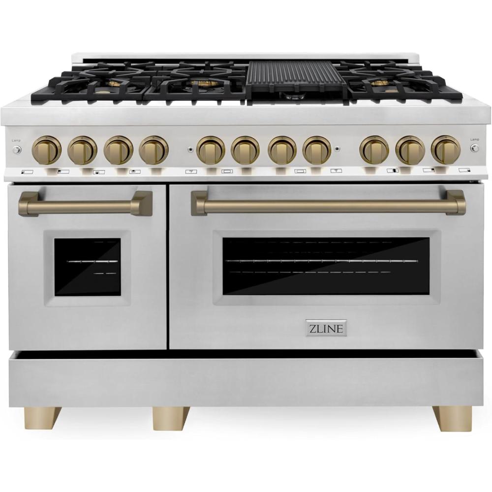 Luxury isn’t meant to be desired – it’s meant to be attainable. The ZLINE Autograph Edition 48 in. 6.0 cu. ft. Legacy Dual Fuel Range with 7 Burner Gas Cooktop and 2 Electric Ovens in Stainless Steel and Champagne Bronze Accents (RAZ-48-CB) pairs a powerful gas cooktop with 7 Italian-crafted burners, a large electric convection oven, a small bake and broil oven, Landscape oven door window designs, and elegant champagne bronze knobs and handles. With innovative features designed to enhance your kitchen’s capability, ZLINE Legacy Dual Fuel Ranges provide a professional culinary experience by pairing unmatched performance with timeless style.