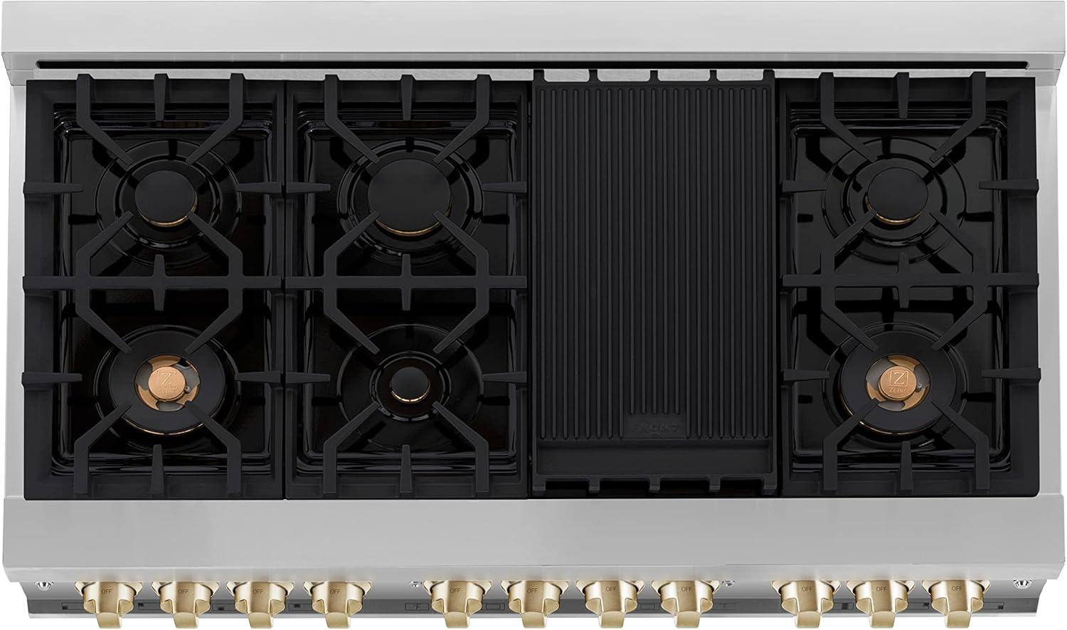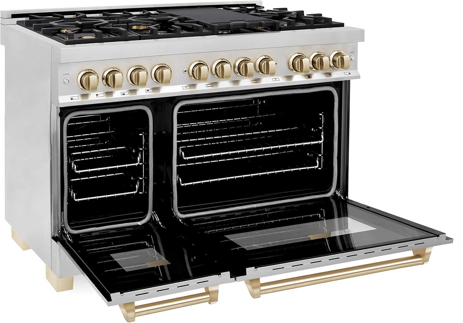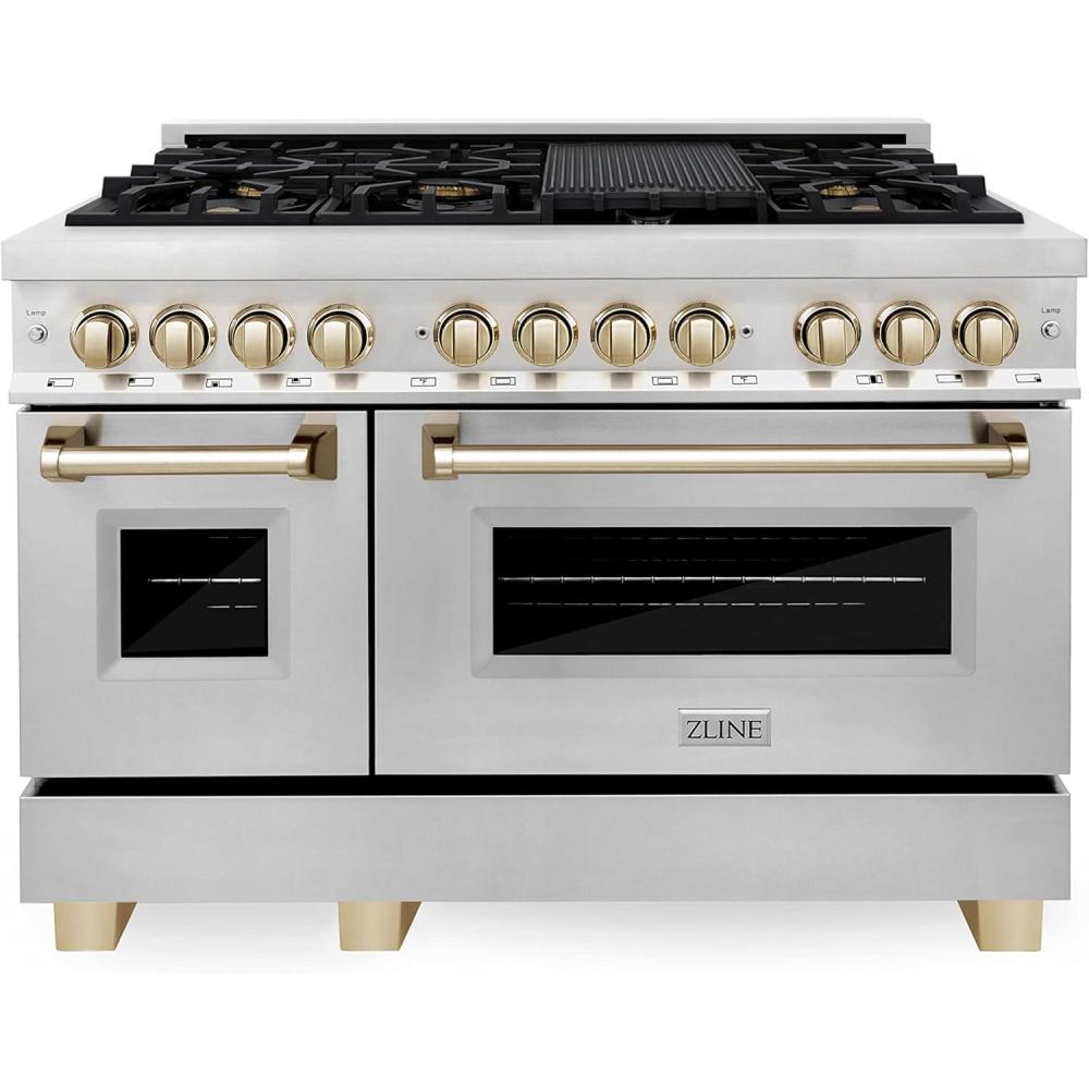 ZLINE Autograph Edition 48 in. 6.0 cu. ft. Legacy Dual Fuel Range with 7 Burner Gas Cooktop and 2 Electric Ovens in Stainless Steel and Polished Gold Accents (RAZ-48-G)