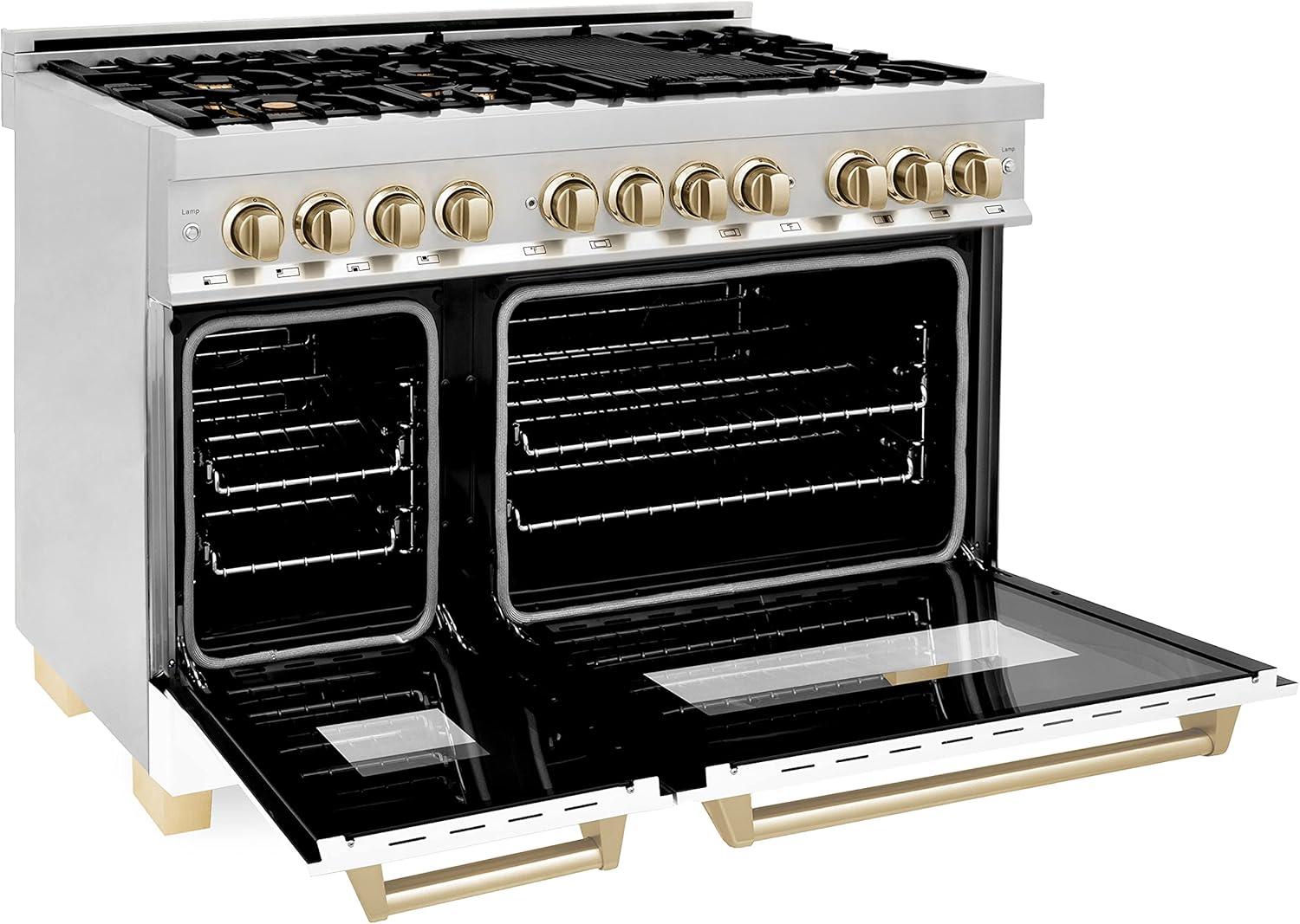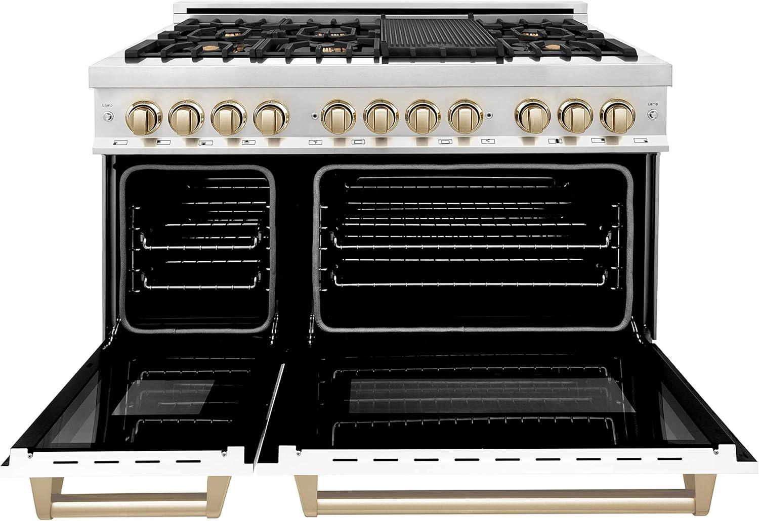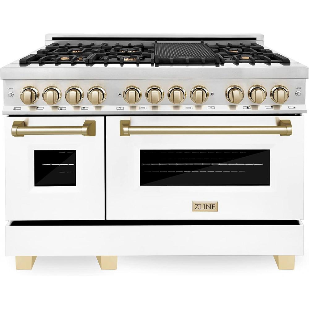 Luxury isn’t meant to be desired – it’s meant to be attainable. The ZLINE Autograph Edition 48 in. 6.0 cu. ft. Legacy Dual Fuel Range with 7 Burner Gas Cooktop and 2 Electric Ovens in Stainless Steel with White Matte Doors and Polished Gold Accents (RAZ-WM-48-G) pairs a powerful gas cooktop with 7 Italian-crafted burners, a large electric convection oven, a small bake and broil oven, beautiful white matte doors with Landscape window designs, and elegant polished gold knobs and handles. With innovative features designed to enhance your kitchen’s capability, ZLINE Legacy Dual Fuel Ranges provide a professional culinary experience by pairing unmatched performance with timeless style.
