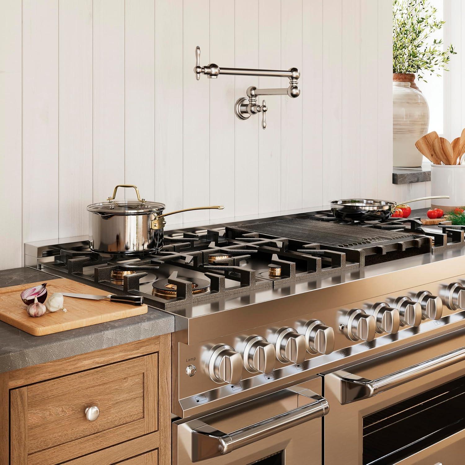 Double-Joint Pivoting – The Rembrandt Pot Filler’s smooth retractable spout extends up to 24” (2 feet) to reach multiple burners thanks to a double-joint swing that optimizes ergonomic control